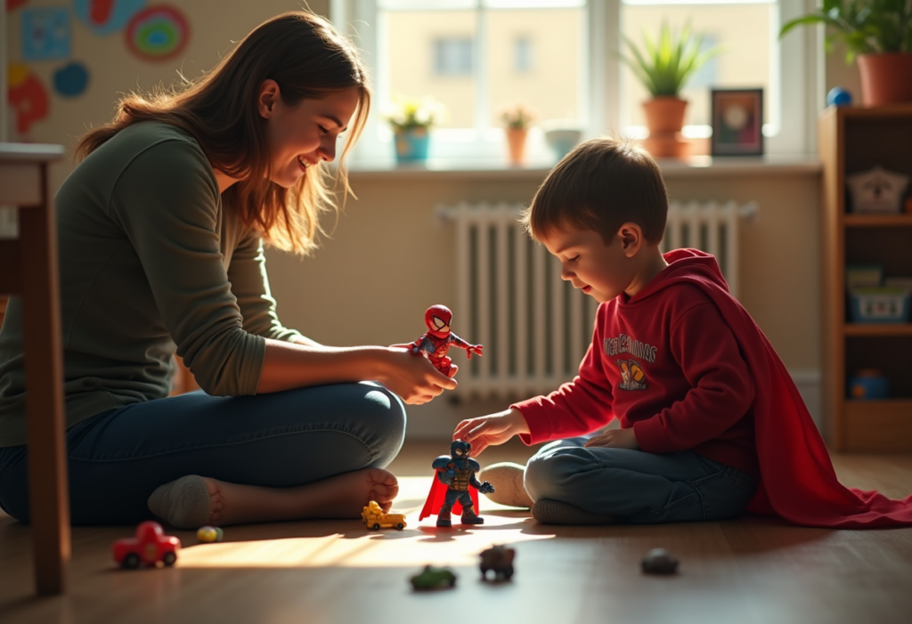 We used his superhero figures. We made sound effects. We crashed things together and made noises. For a while, there were no words at all — just a parent and a child playing together in a room that happened to be inside a school building.