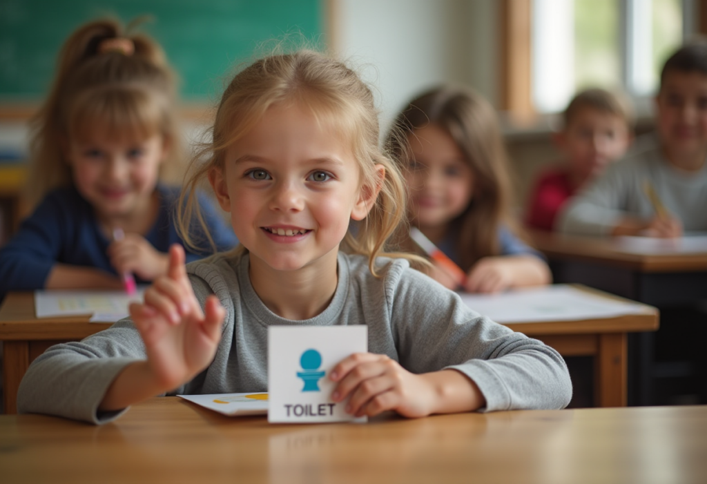 As the child becomes more comfortable, some may naturally begin to use simple words alongside the cards. For example, a child might eventually say “toilet” while handing over the card.